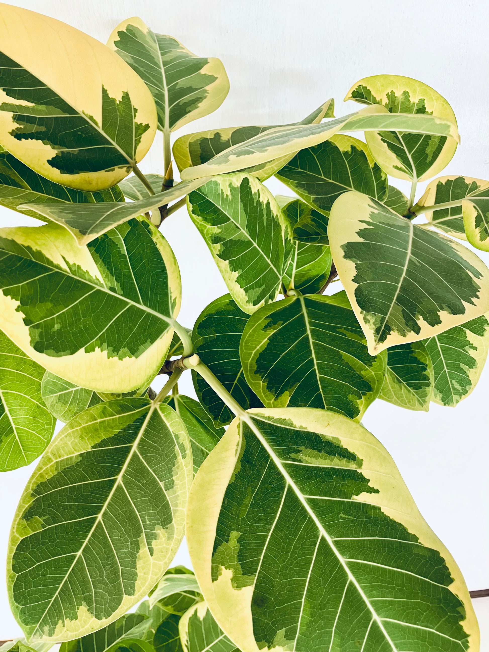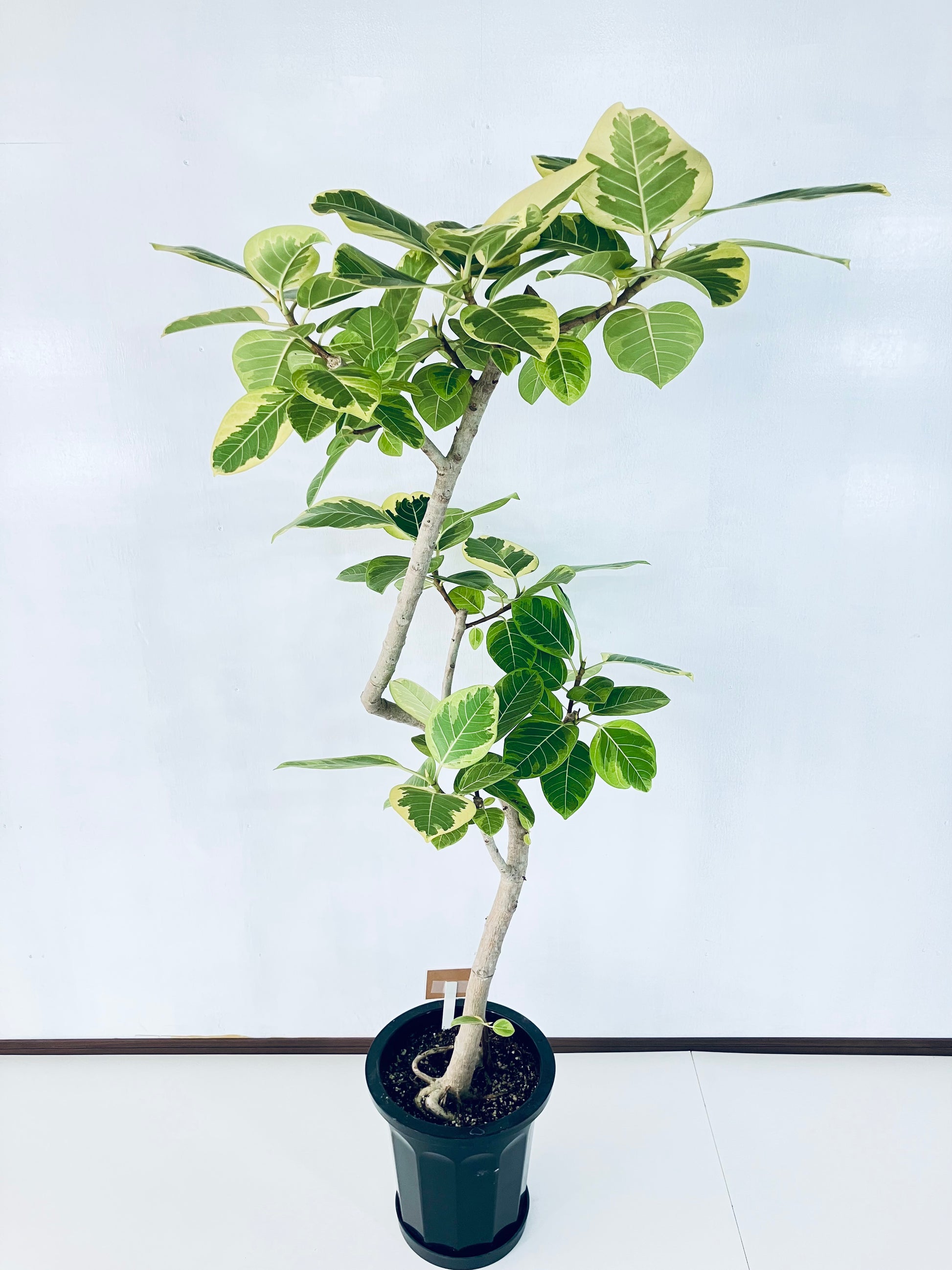 アルテシマは鮮やかな黄色い斑が特徴の、人気の観葉植物です。ゴムの木の仲間で生長が早く、沖縄では外で育てることも可能です。10号サイズは室内でかなり迫力のある大きさです。