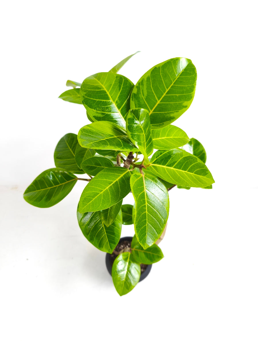 アルテシマは鮮やかな黄色い斑が特徴の、人気の観葉植物です。ゴムの木の仲間で生長が早く、沖縄では外で育てることも可能です。6号サイズは室内に飾るのにちょうどいい大きさです。