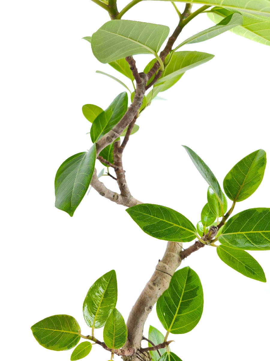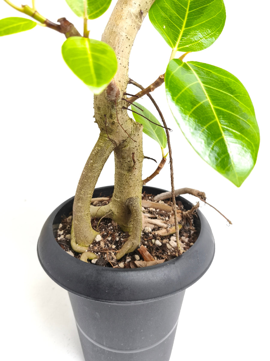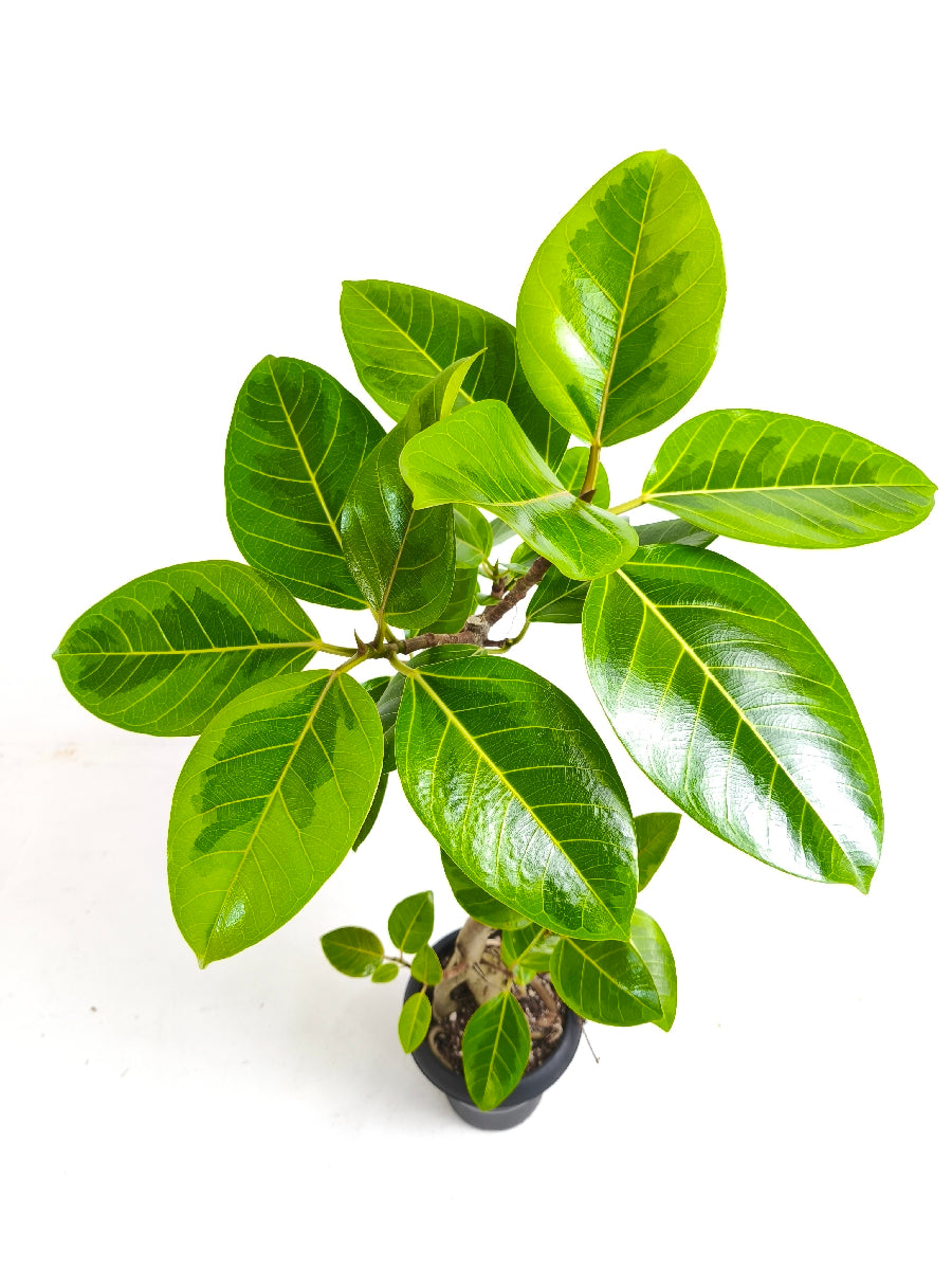 アルテシマは鮮やかな黄色い斑が特徴の、人気の観葉植物です。ゴムの木の仲間で生長が早く、沖縄では外で育てることも可能です。6号サイズは室内に飾るのにちょうどいい大きさです。