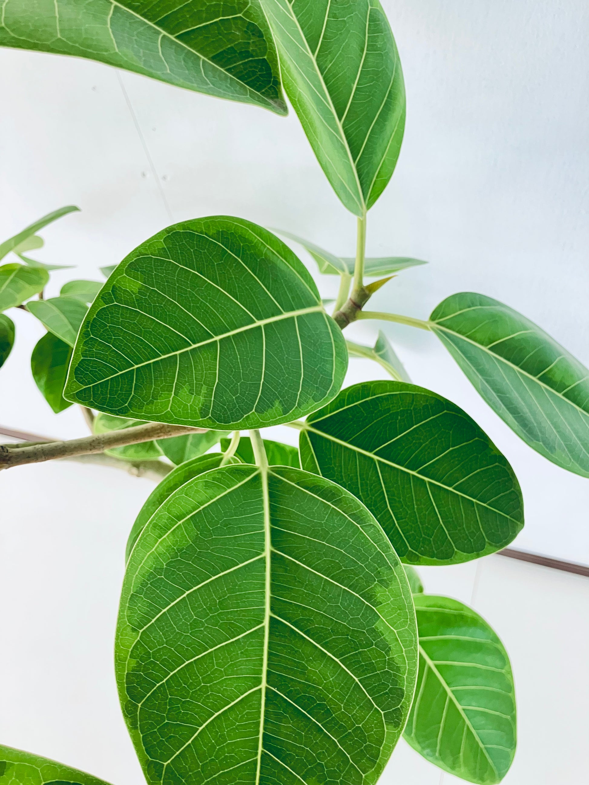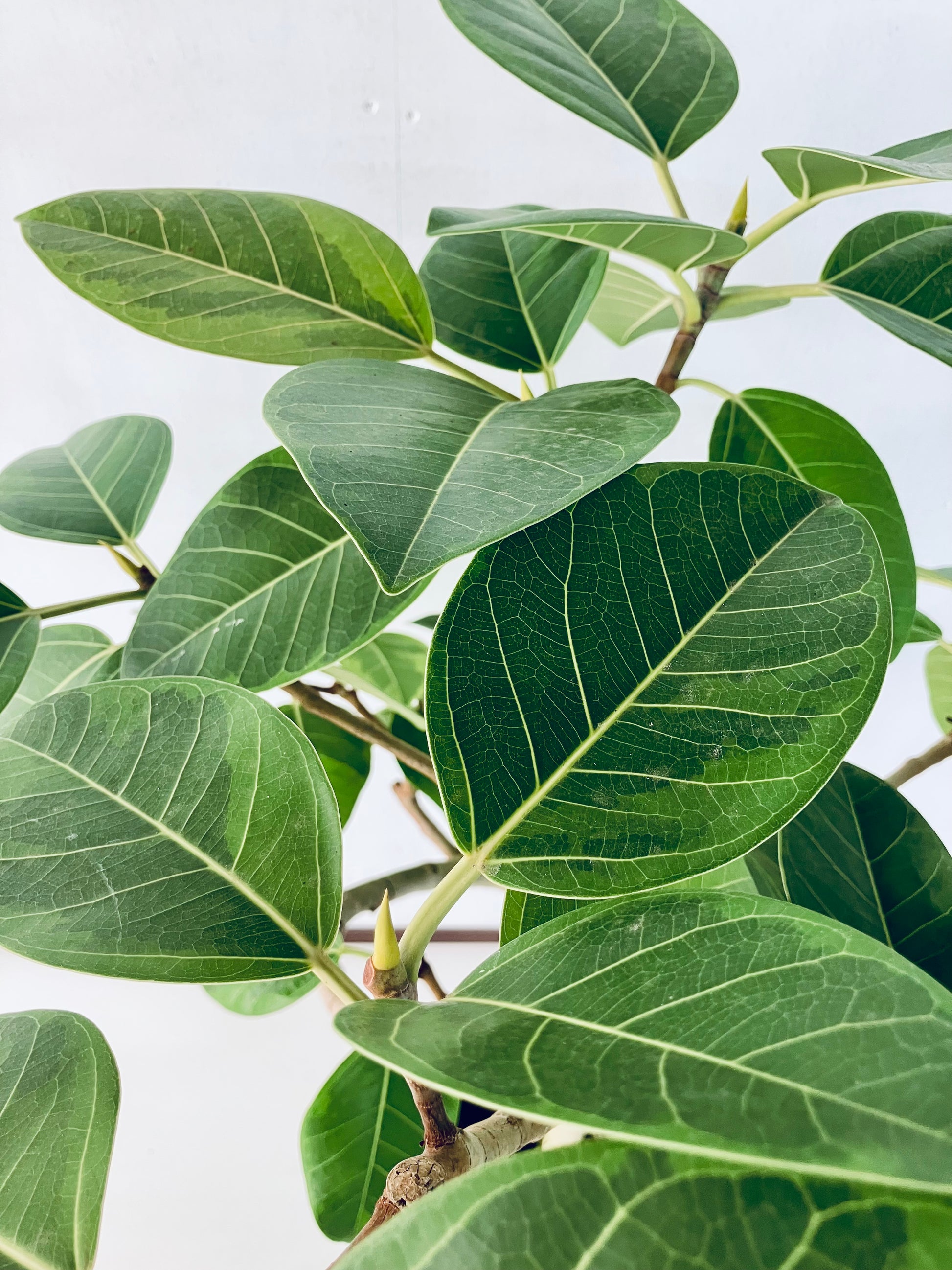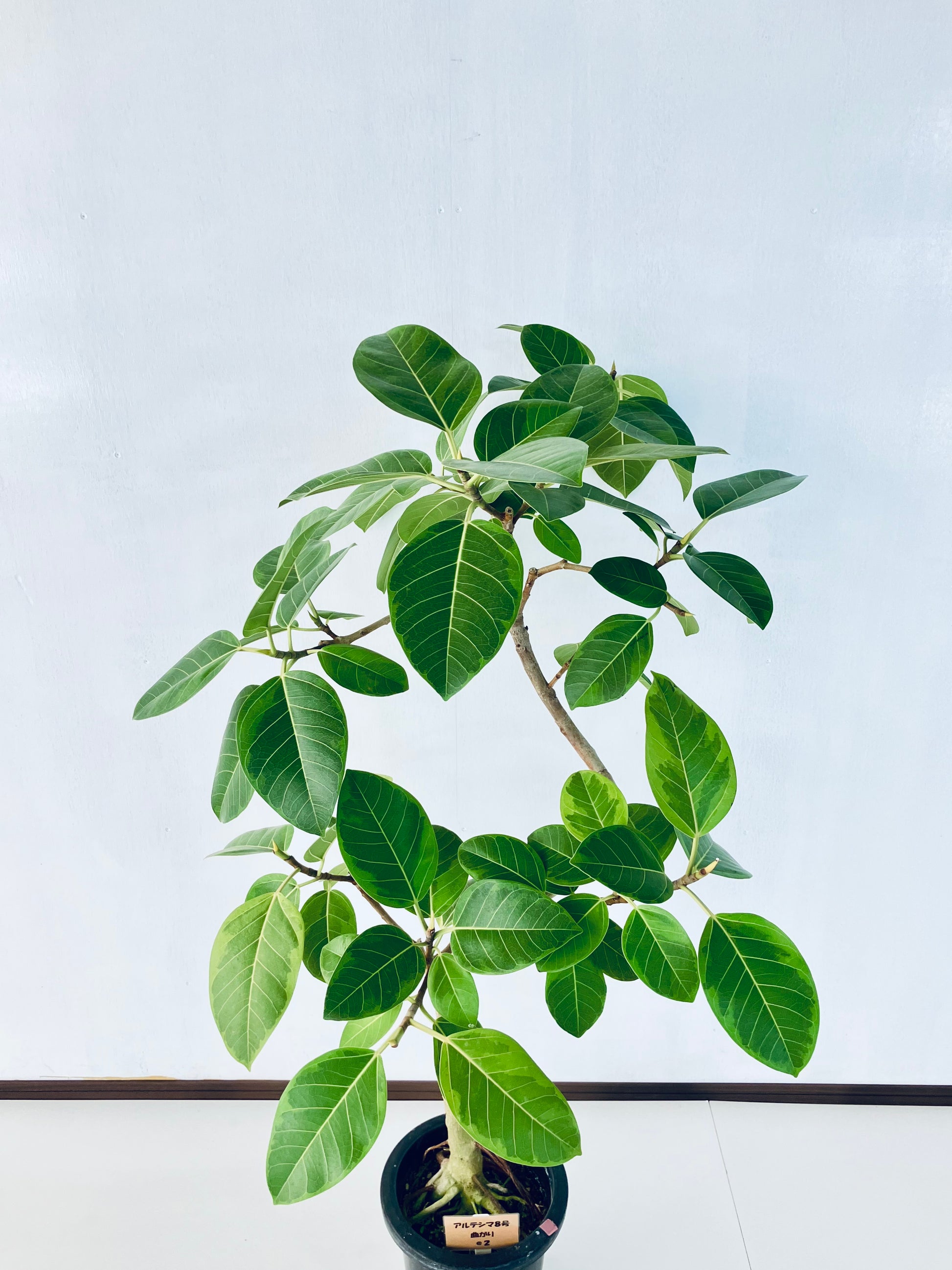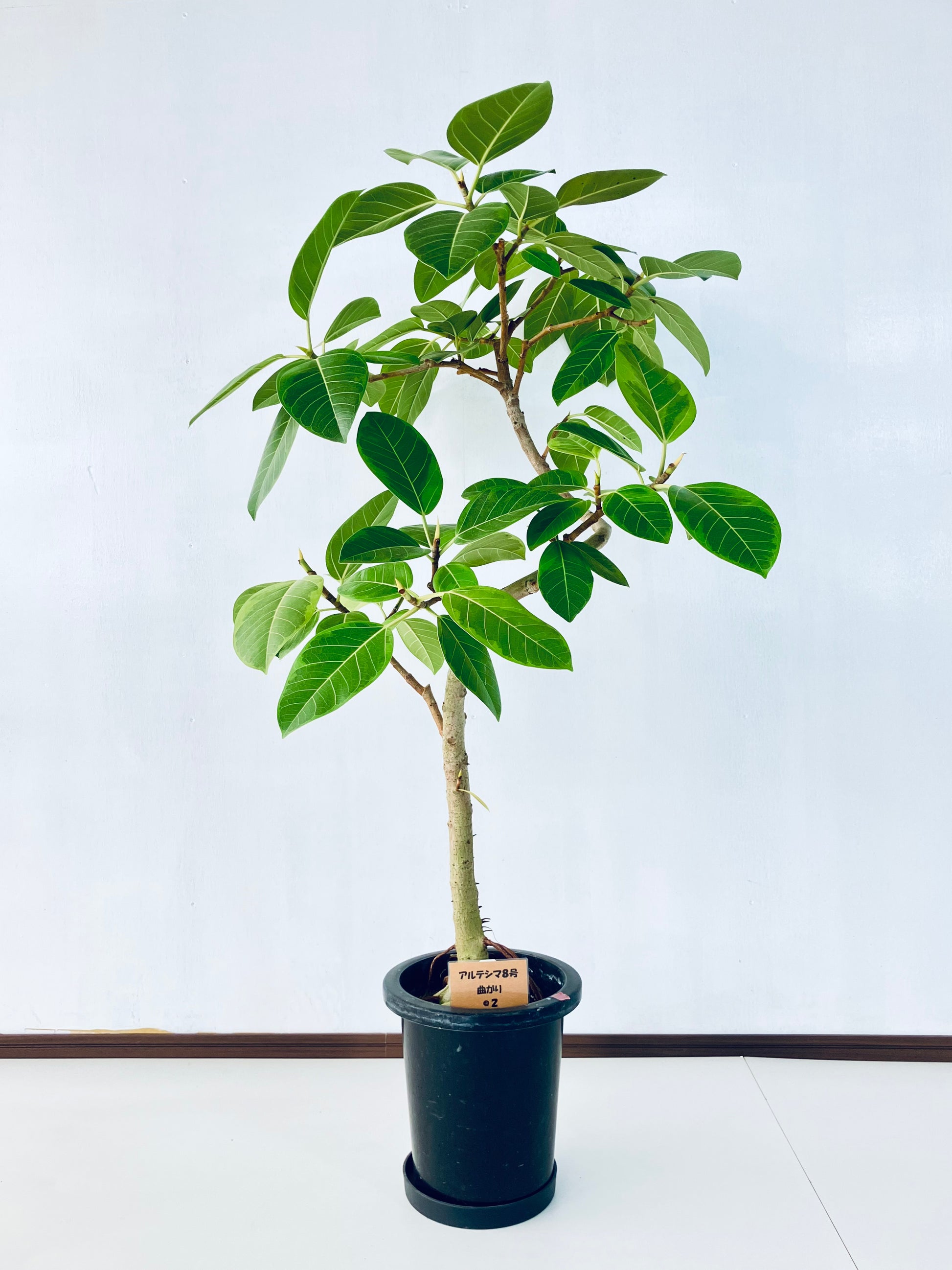 アルテシマは鮮やかな黄色い斑が特徴の、人気の観葉植物です。ゴムの木の仲間で生長が早く、沖縄では外で育てることも可能です。8号サイズは室内で十分な存在感のある大きさです。