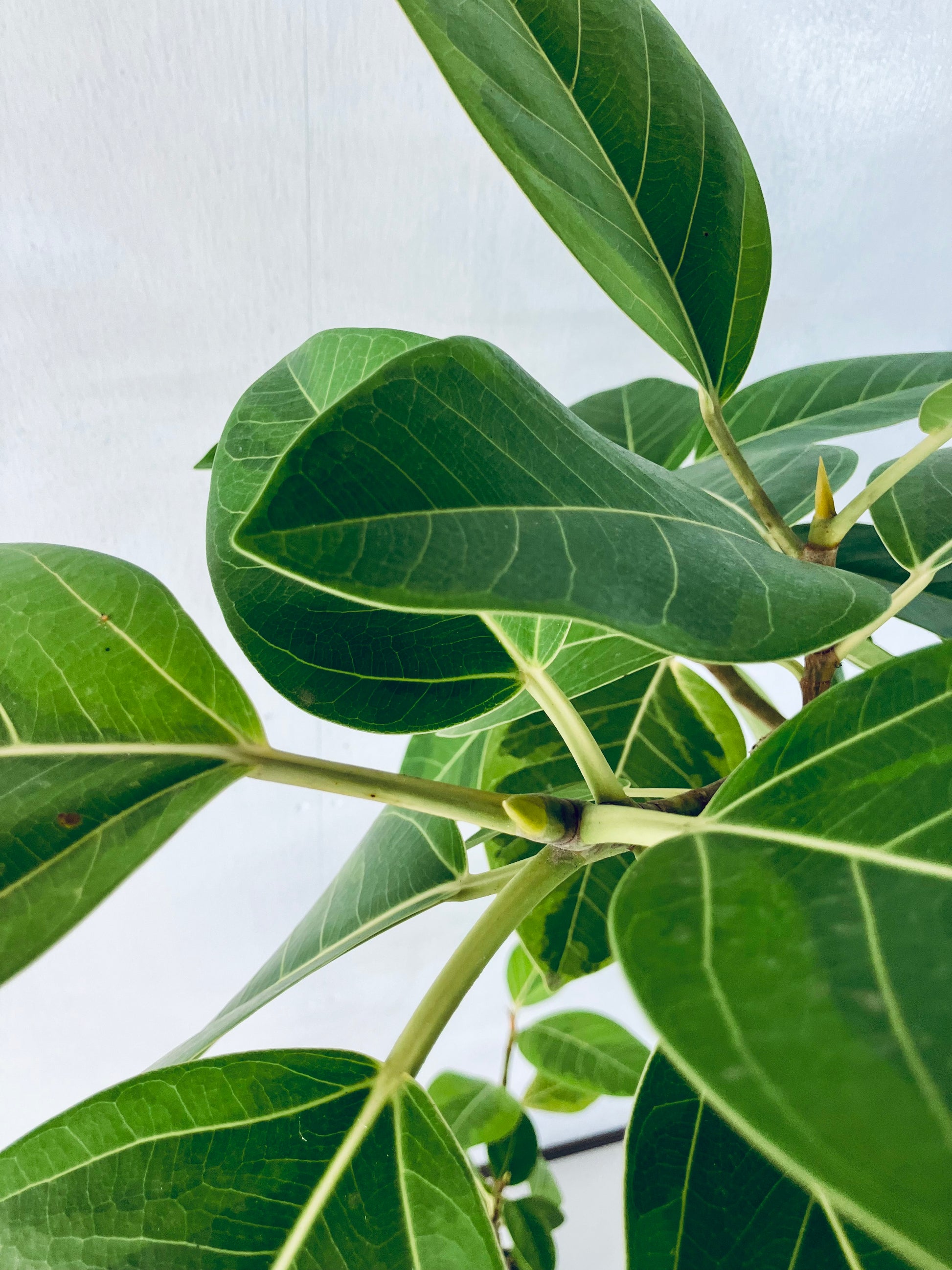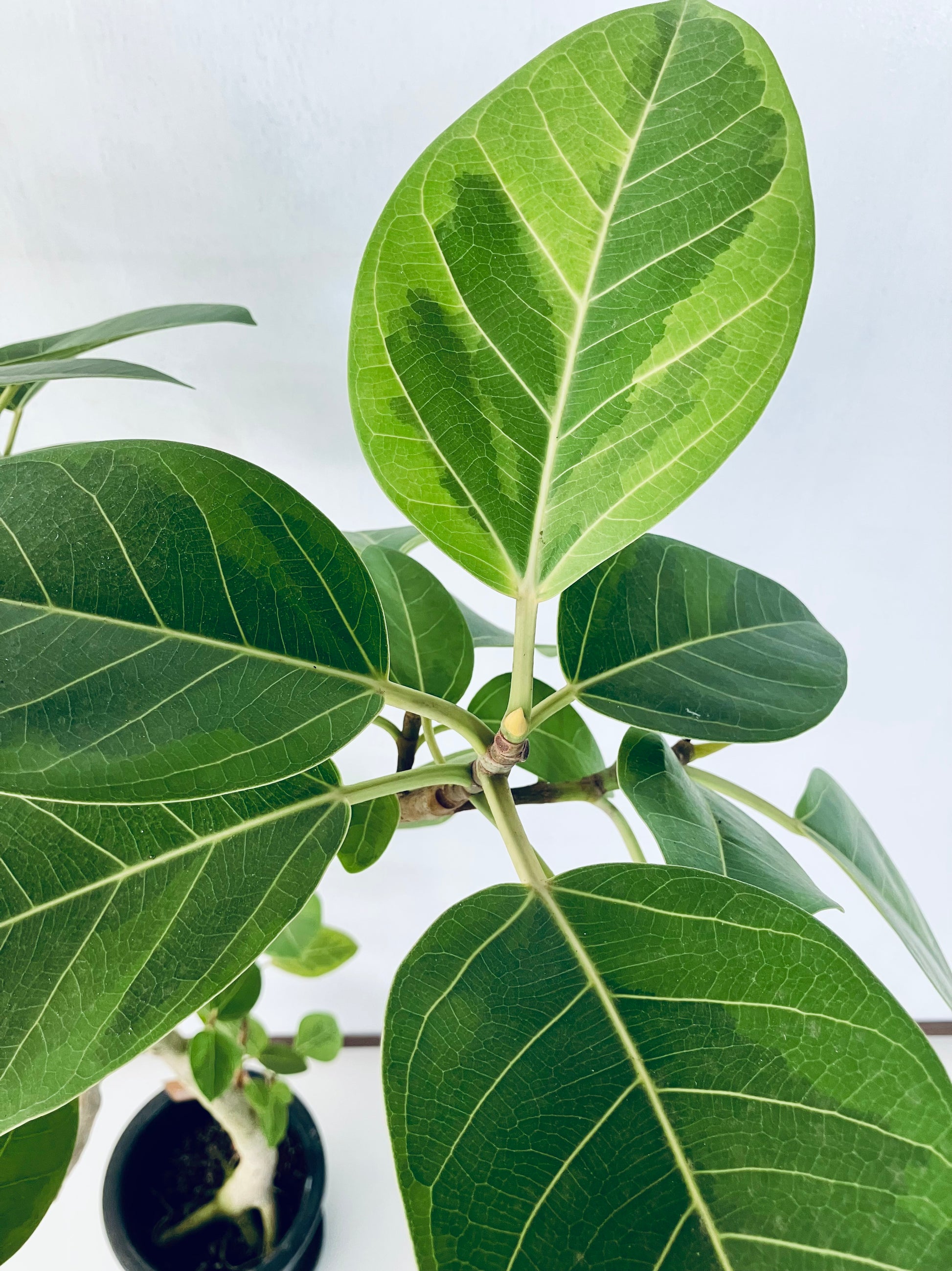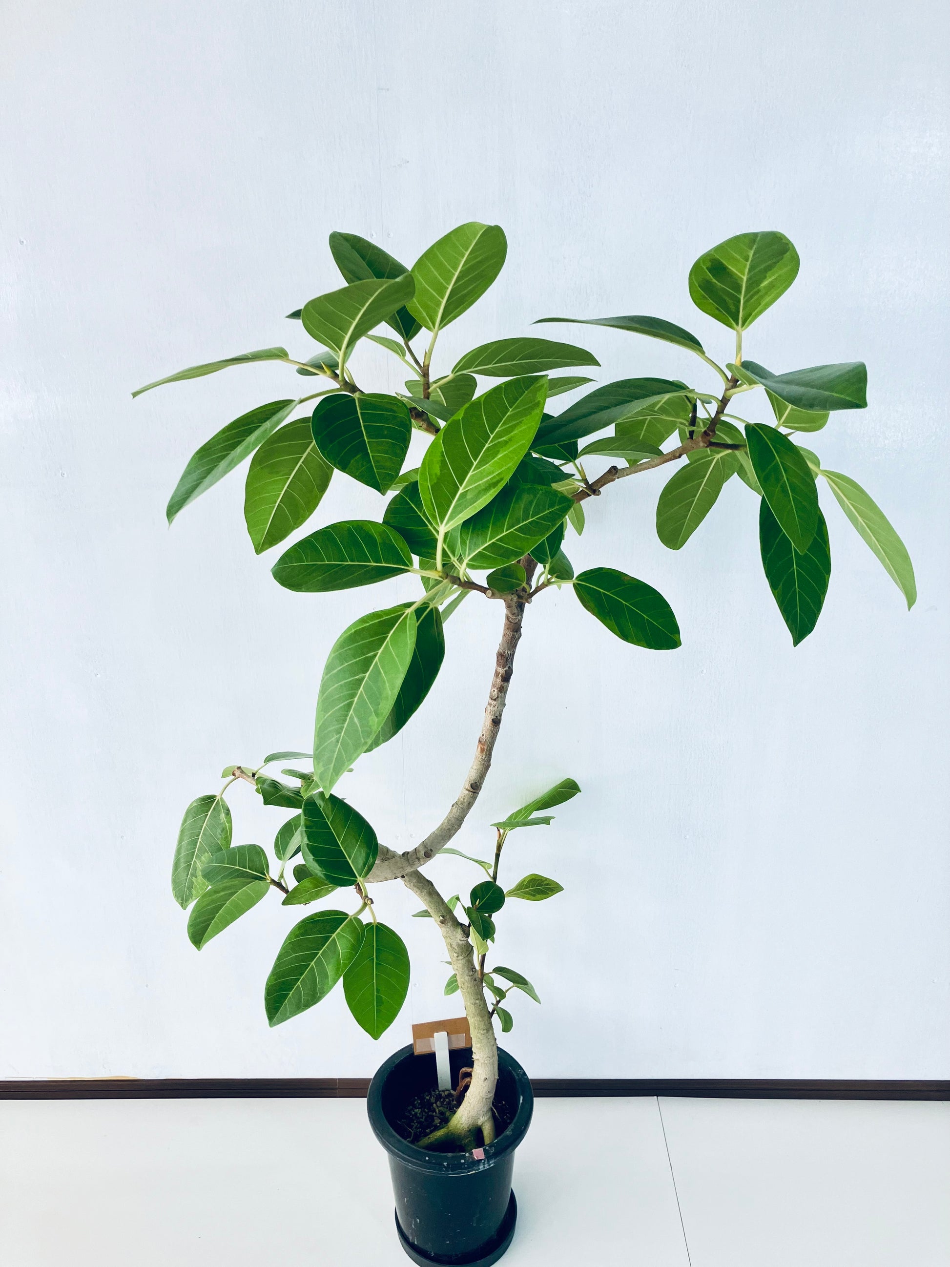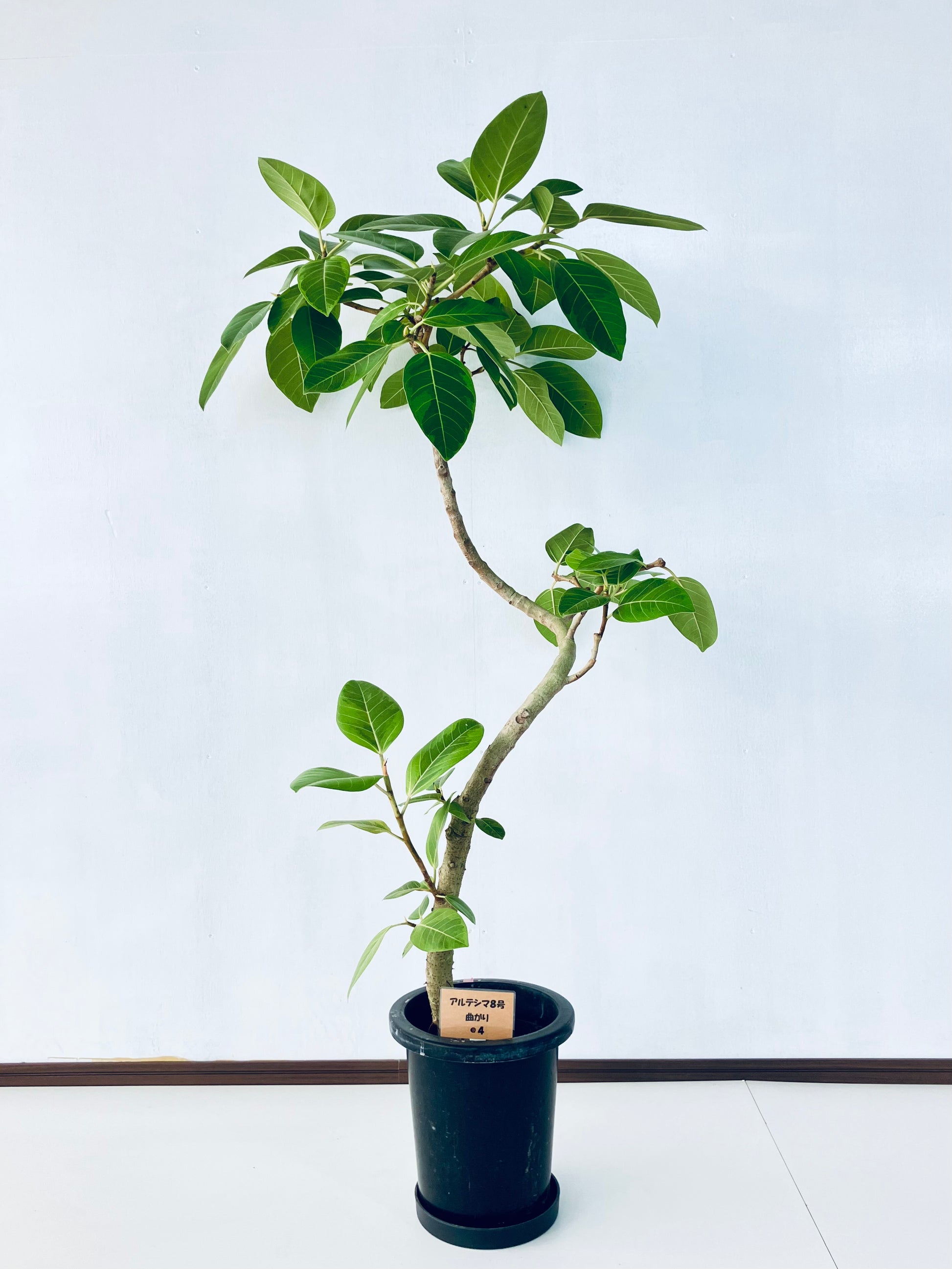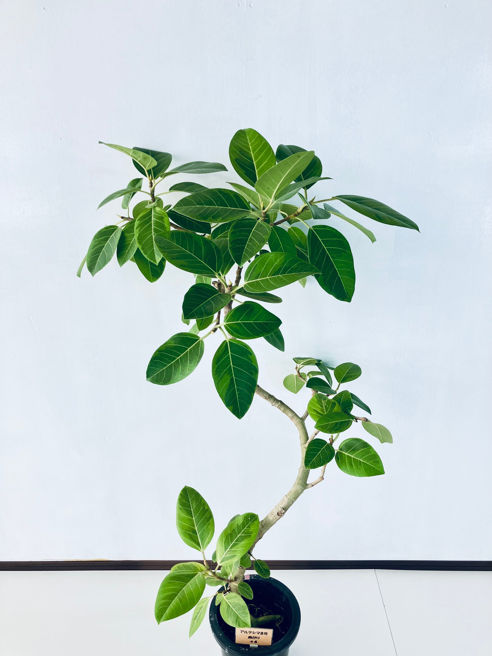 アルテシマは鮮やかな黄色い斑が特徴の、人気の観葉植物です。ゴムの木の仲間で生長が早く、沖縄では外で育てることも可能です。8号サイズは室内で十分な存在感のある大きさです。