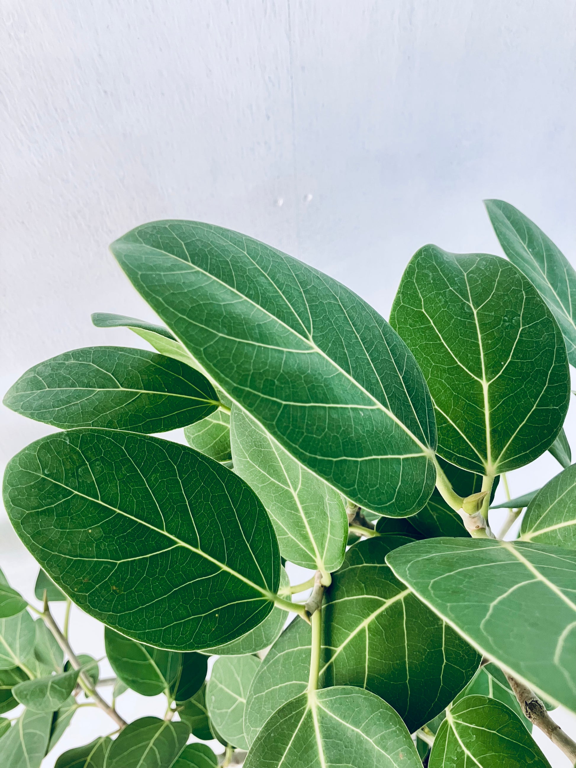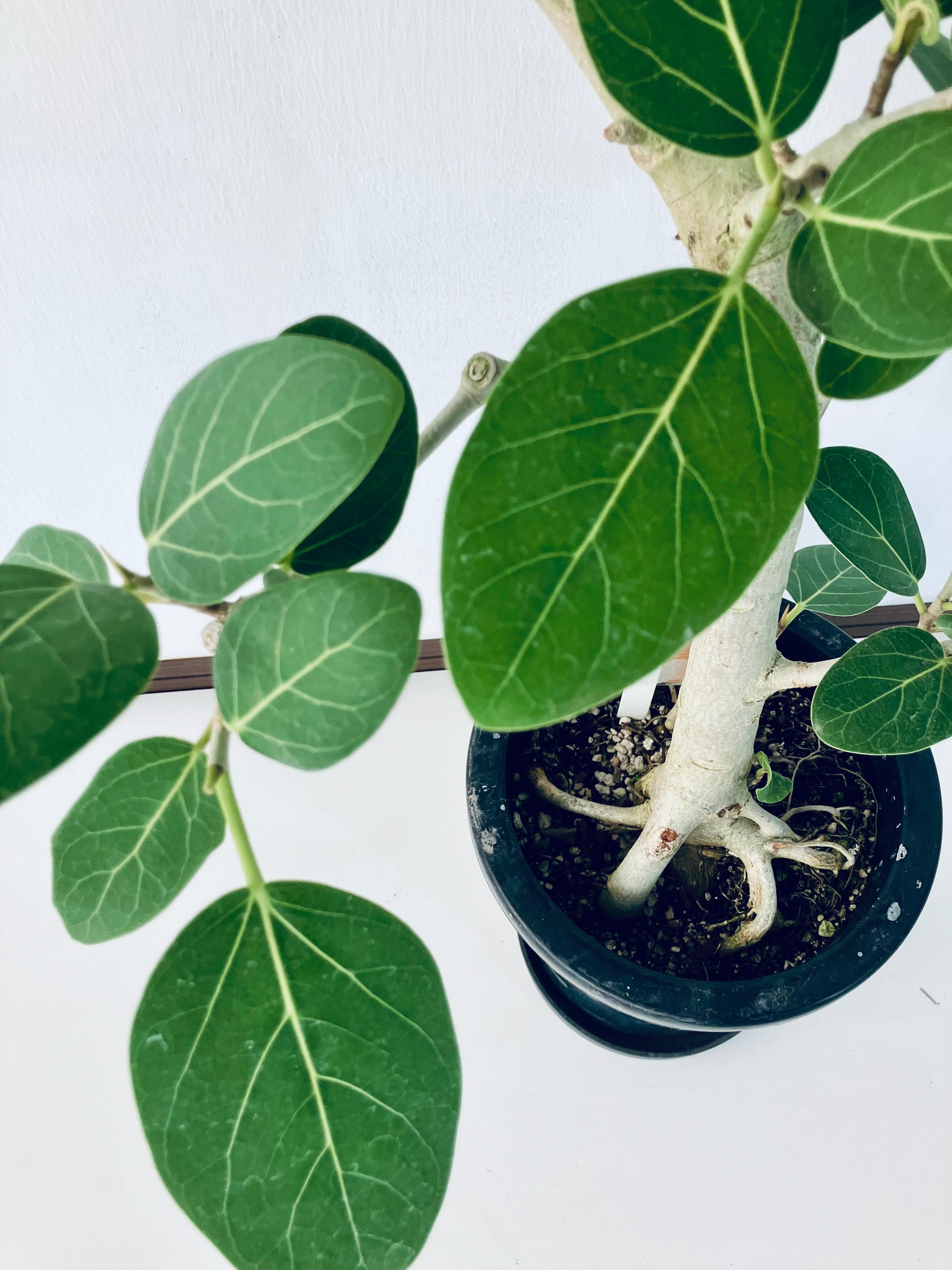ベンガレンシスは丸い葉と白い幹が特徴の人気の観葉植物です。ゴムの木の仲間で生長が早く、育てやすい品種です。8号サイズは室内で十分な存在感のある大きさです。